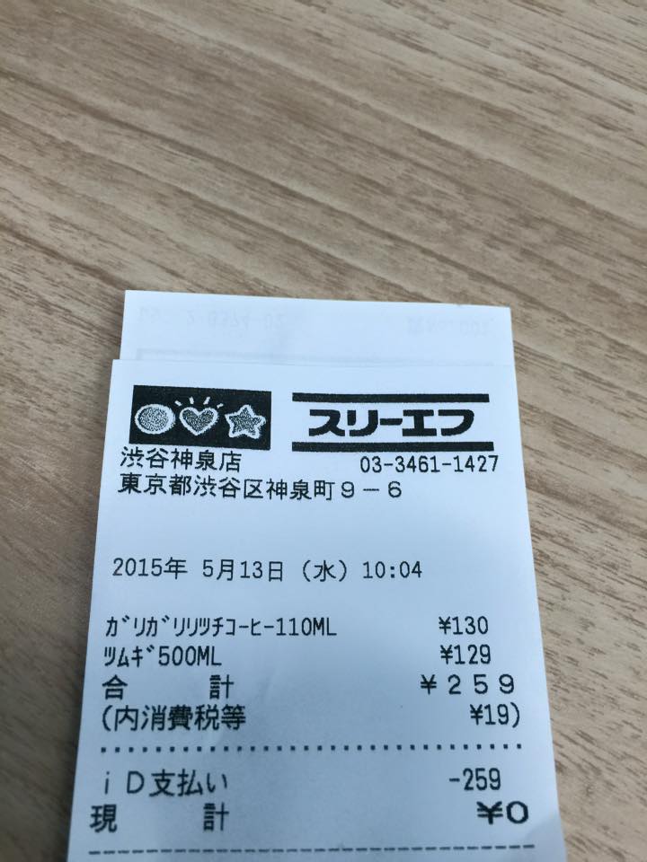スリーエフでガリガリ君リッチコーヒーオレと つむぎを購入し、T-Pointカードを提出し、iDで決済してもらったレシートの上半分画像がこちらになります。