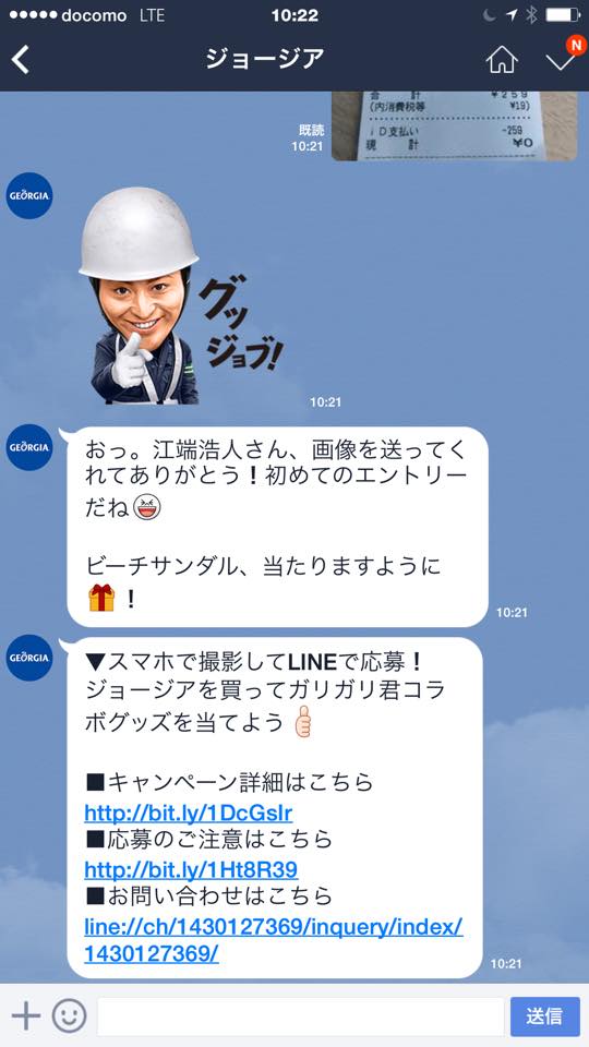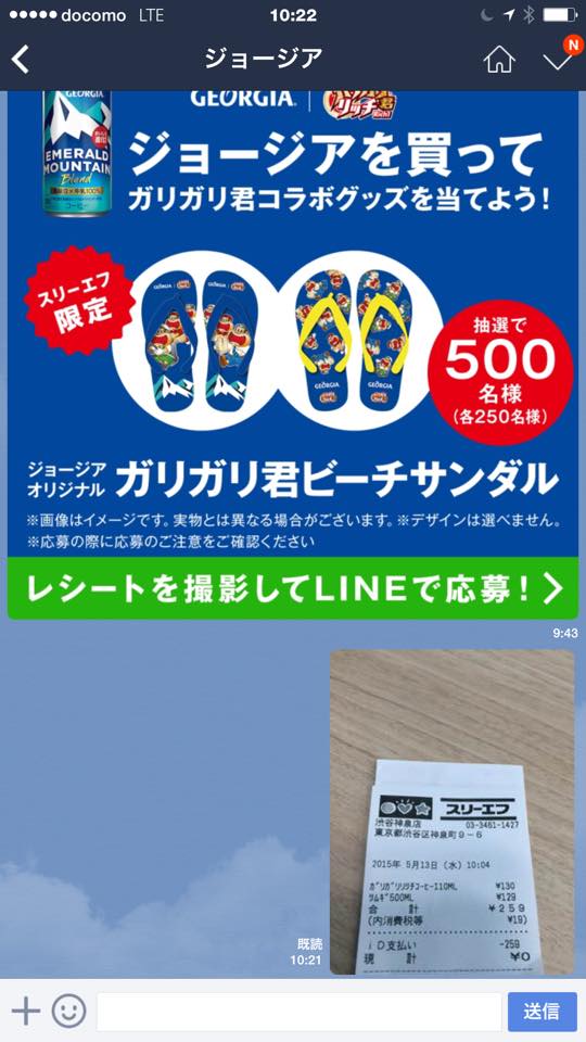 何と、この画像をジョージアのLINE公式アカウントに送るだけでキャンペーン応募ができてしまうのです。商品はコラボサンダル。 スリーエフ限定のキャンペーンです。対象商品はジョージア製品一般と、ガリガリ君リッチコーヒーオレになります。(レシート有効期間:2015年5月11日(月)〜6月7日(日)、応募期間:2015年5月11日(月)〜6月14日(日))