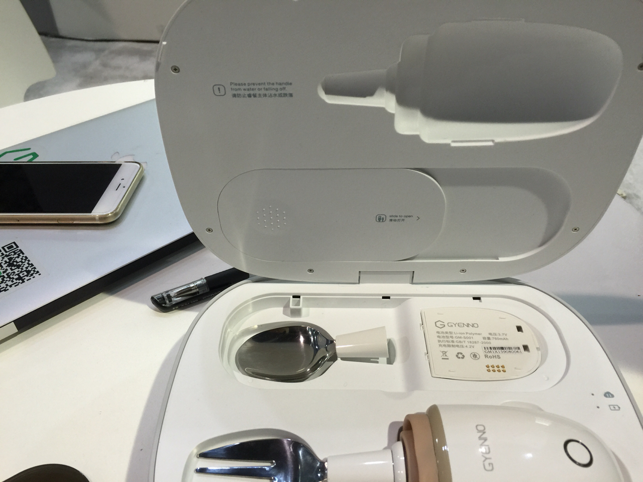 手元が震えて食事が難しい人向けに開発されたもので、中国企業のGYENNOが展示していたもの。
