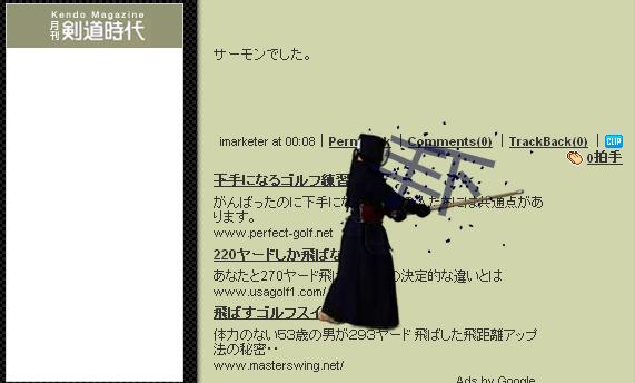 下の月刊剣道時代のブログパーツは「弱気な言葉と真っ向勝負」するブログパーツで「対決」ボタンを押すと弱気の言葉を竹刀でしとめるというものである。