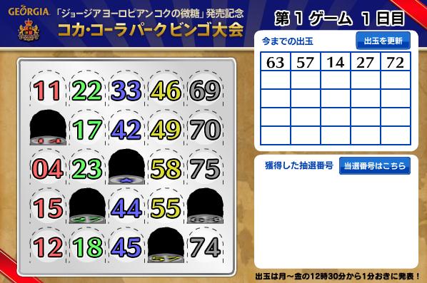 コカ・コーラ パーク ビンゴ大会 初日の出だまは 63、57、14、27、72 です。 http://bit.ly/dhY323