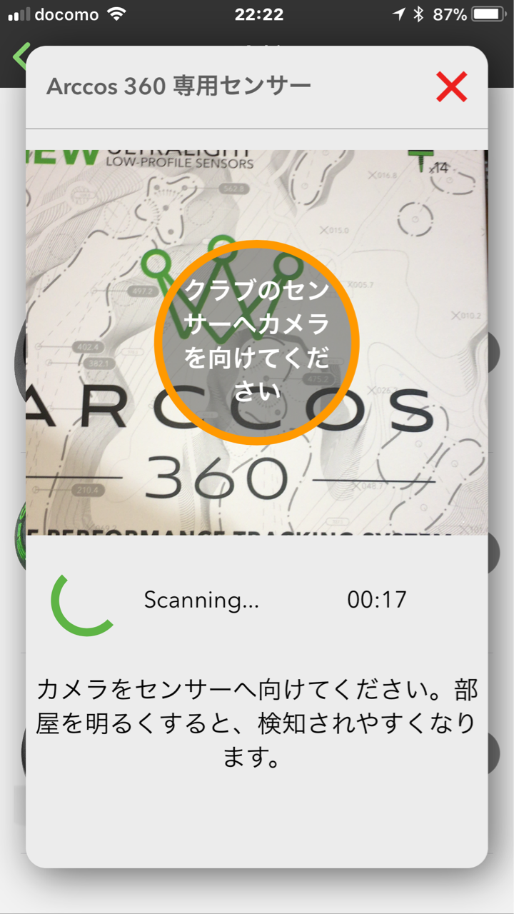 全てのクラブにセンサーを装着したら、いよいよペアリングです。このペアリングの仕組みは正確にはわからないのですが、QRコードを読み込むように簡単に実行できます。また、ペアリングにはBuletoothをONにする必要もあり、カメラや音声もONにする必要があるようです。ということはセンサーには電池が組み込まれており、これは最低5年持つようです。(切れた後どうなるんだろう、センサーはGDOで販売しており単体で2,500円ほどなので丸ごと交換すると推測)