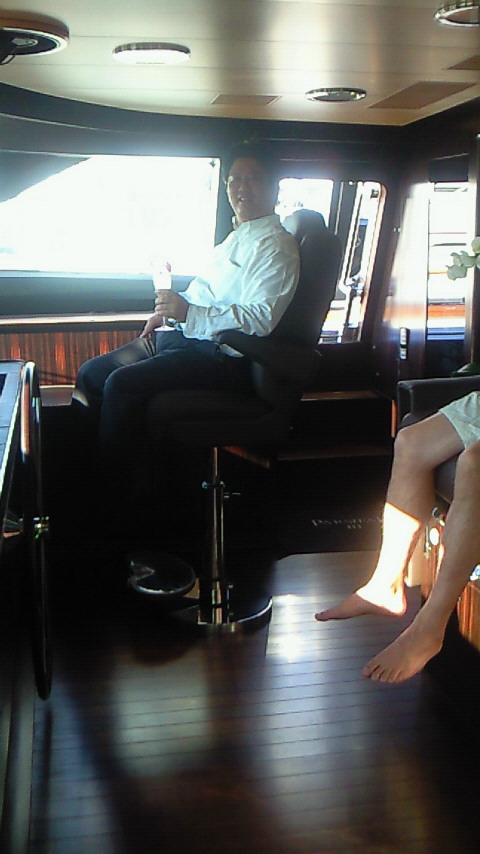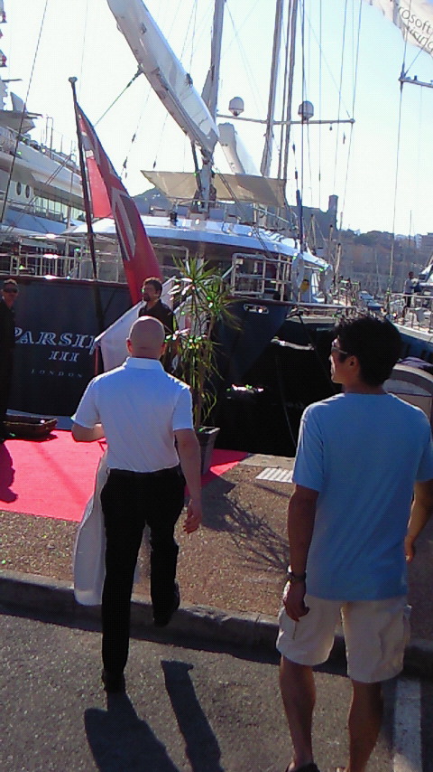 停泊したままであったが一般のホテルより豪華なつくりで、70億円。12名が宿泊できるそうである。オーナーはイタリアのコーヒーメーカー王らしい。