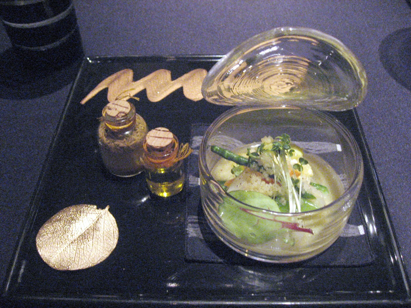 最初はロブション風キャビア、キャビアの味を生かした複雑な味わいが口の中に広がる。シャンパンに良く合う。キャビアのつぶつぶの写真をあしらった台で。
