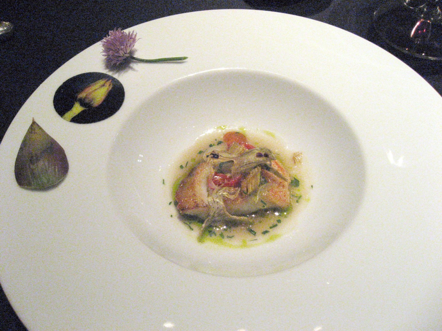 アーティチョークは本来”えぐみ”の強い野菜であるが、周りを揚げ、真ん中の部分をうまく処理することで繊細なキンキにあわせられる風に仕上げてある。
